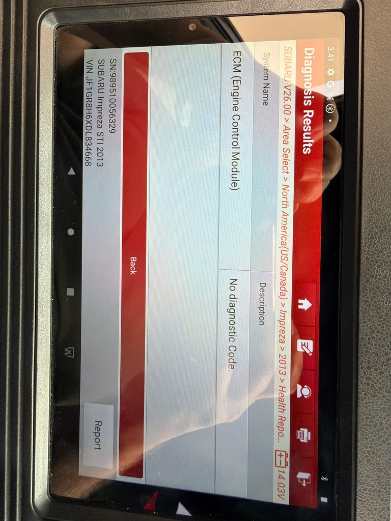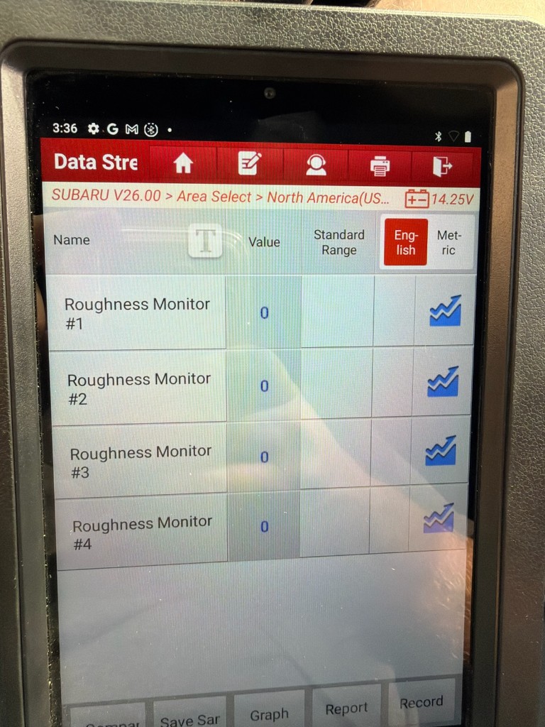 - Performed diagnostics for misfires; injector roughness monitors were all zero and no DTCs were present at this time.